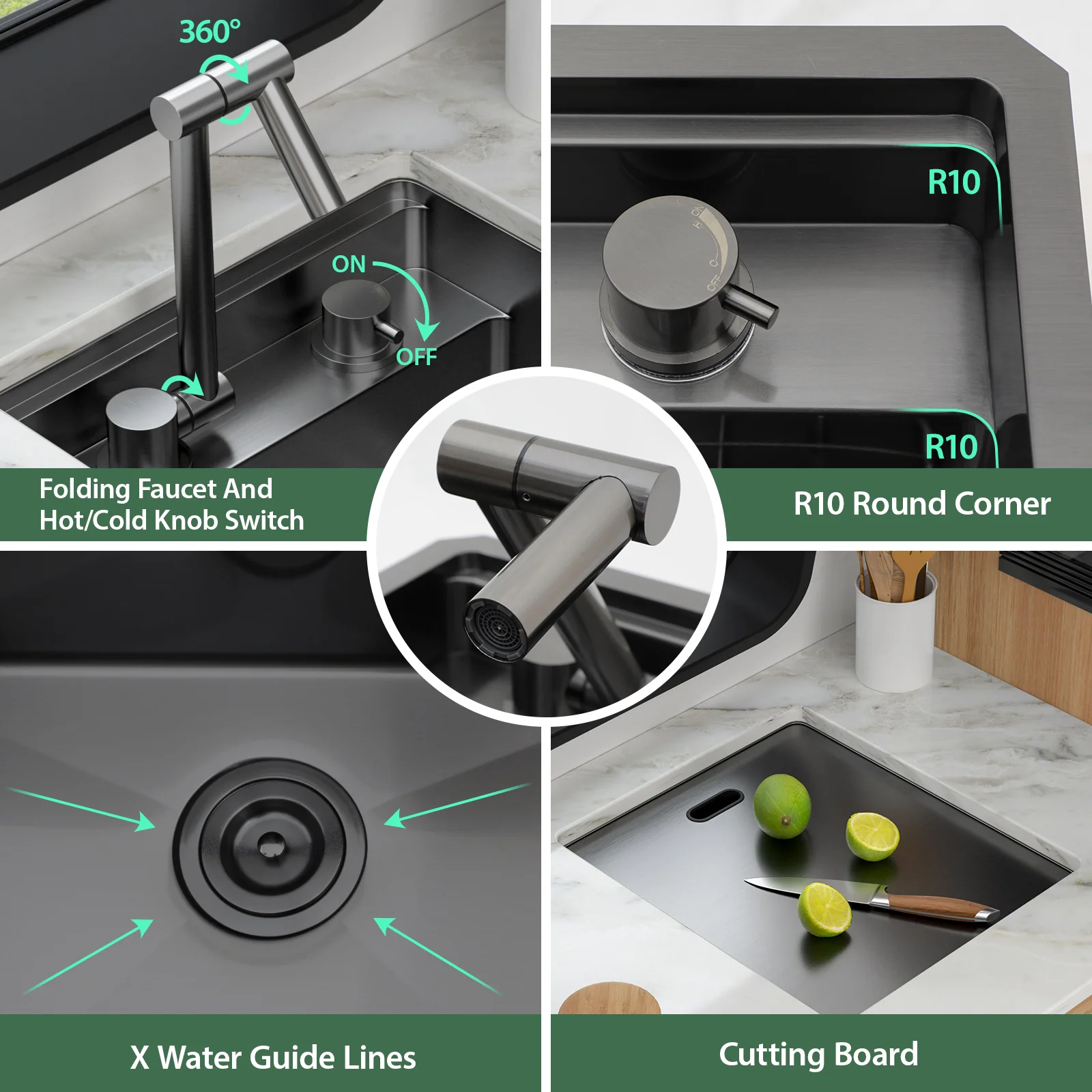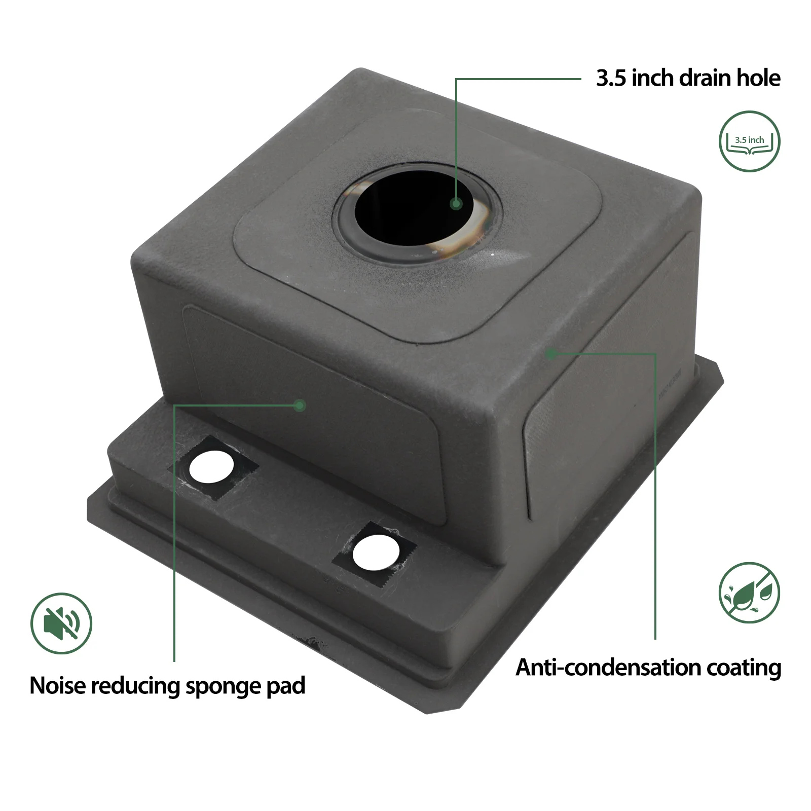 Center drain gently sloped bottom and X grooves that avoids water from pooling in the sink .Heavy duty sound guard undercoating and softer rubber noise reduction padding to absorb vibration and minimize noise when the stainless steel single bowl kitchen sink is in use.