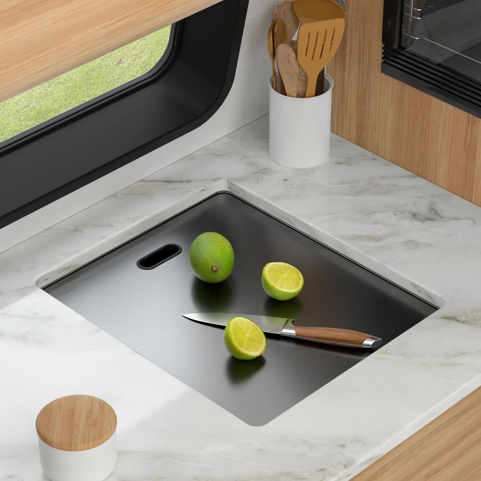 Deep single bowl sink with tight-radius corners and rear center drain creates an uninterrupted workspace for washing your largest cookware, like stock pots and baking sheets – Undermount Kitchen sink creates a seamless transition from sink to countertop – Smart design adds valuable counter space by allowing you to work right over the sink, perfect for a kitchen of any size.