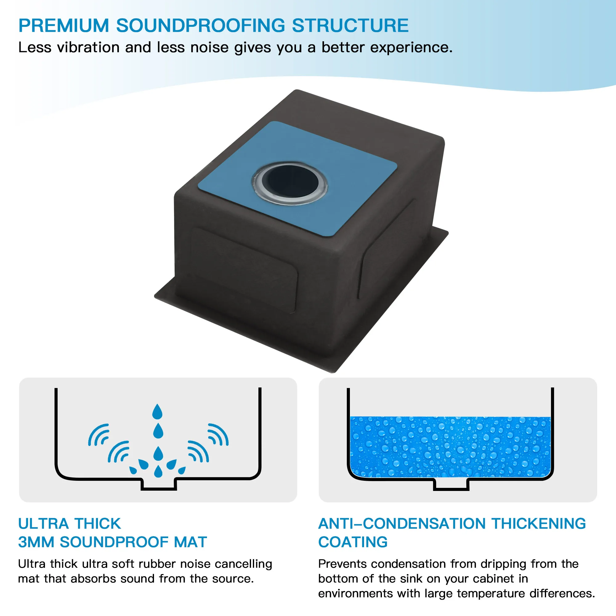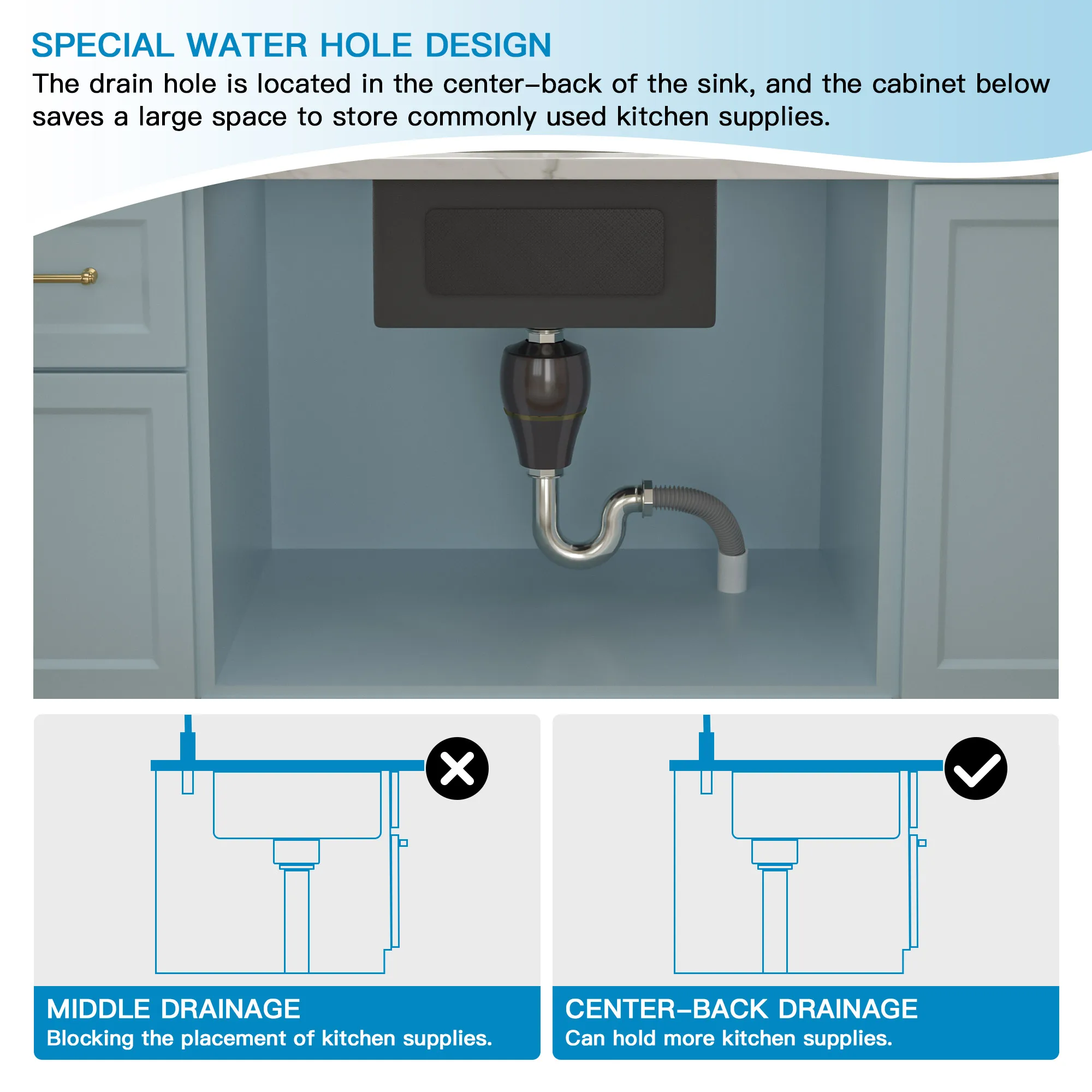 Center drain gently sloped bottom and X grooves that avoids water from pooling in the sink .Heavy duty sound guard undercoating and softer rubber noise reduction padding to absorb vibration and minimize noise when the stainless steel single bowl kitchen sink is in use.