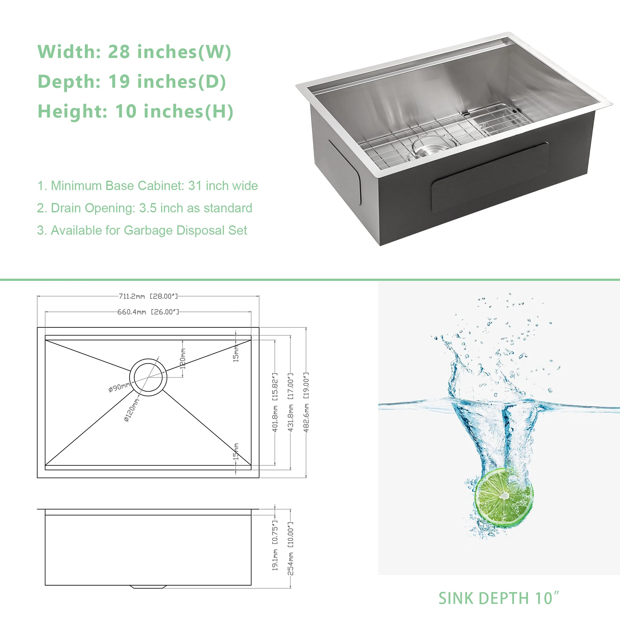 28-inch 16 Gauge Undermount Single Bowl Stainless Steel Kitchen Sink
