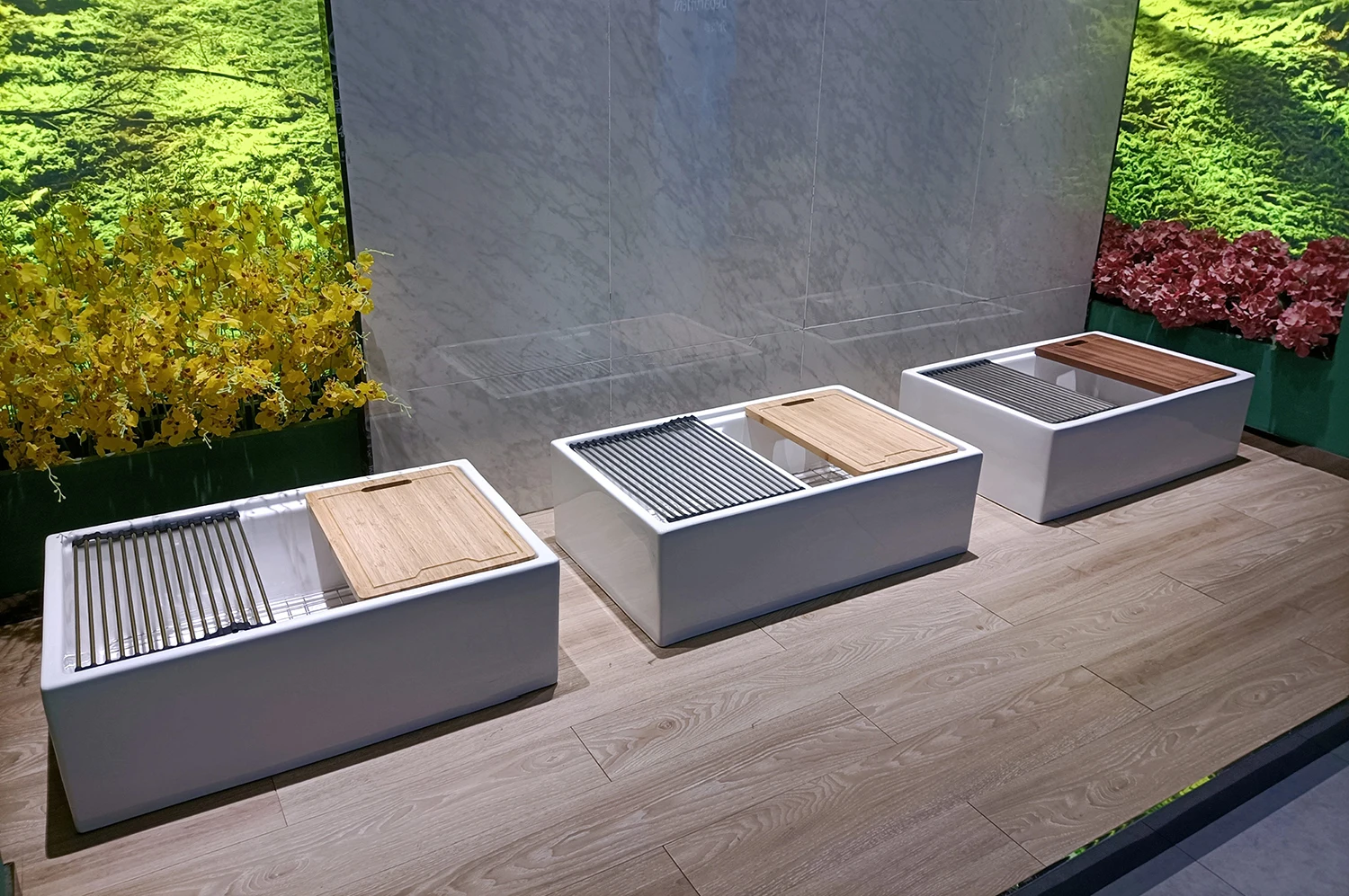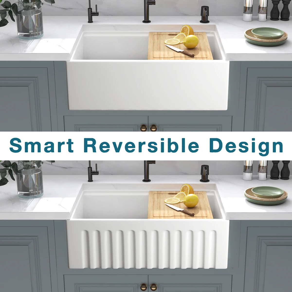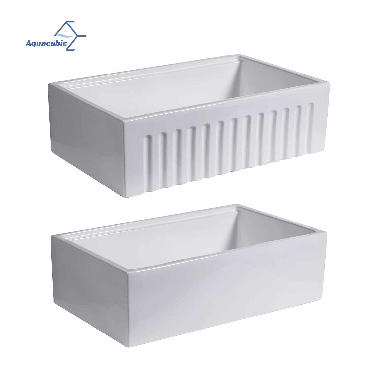 Aquacubic fireclay sinks are flat on one side, and have a fluted pattern on the other side.