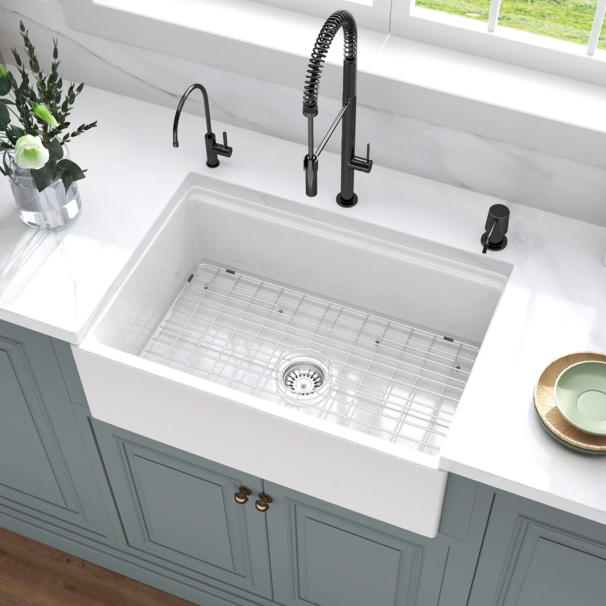【Ultra Fine Fireclay Farmhouse Workstation Sink 】Aquacubic Farmhouse sink 30 inch for kitchens is made of high-grade natural fireclay by artisan, fired at extremely high temperature above 2300℉, advanced high-end material structure offers unmatched protection against impact, thermal shock and scratch that ensure the quality of sink, Aquacubic white fireclay apron front farmhouse kitchen sinks offer superior strength and durability to withstand heavy use!