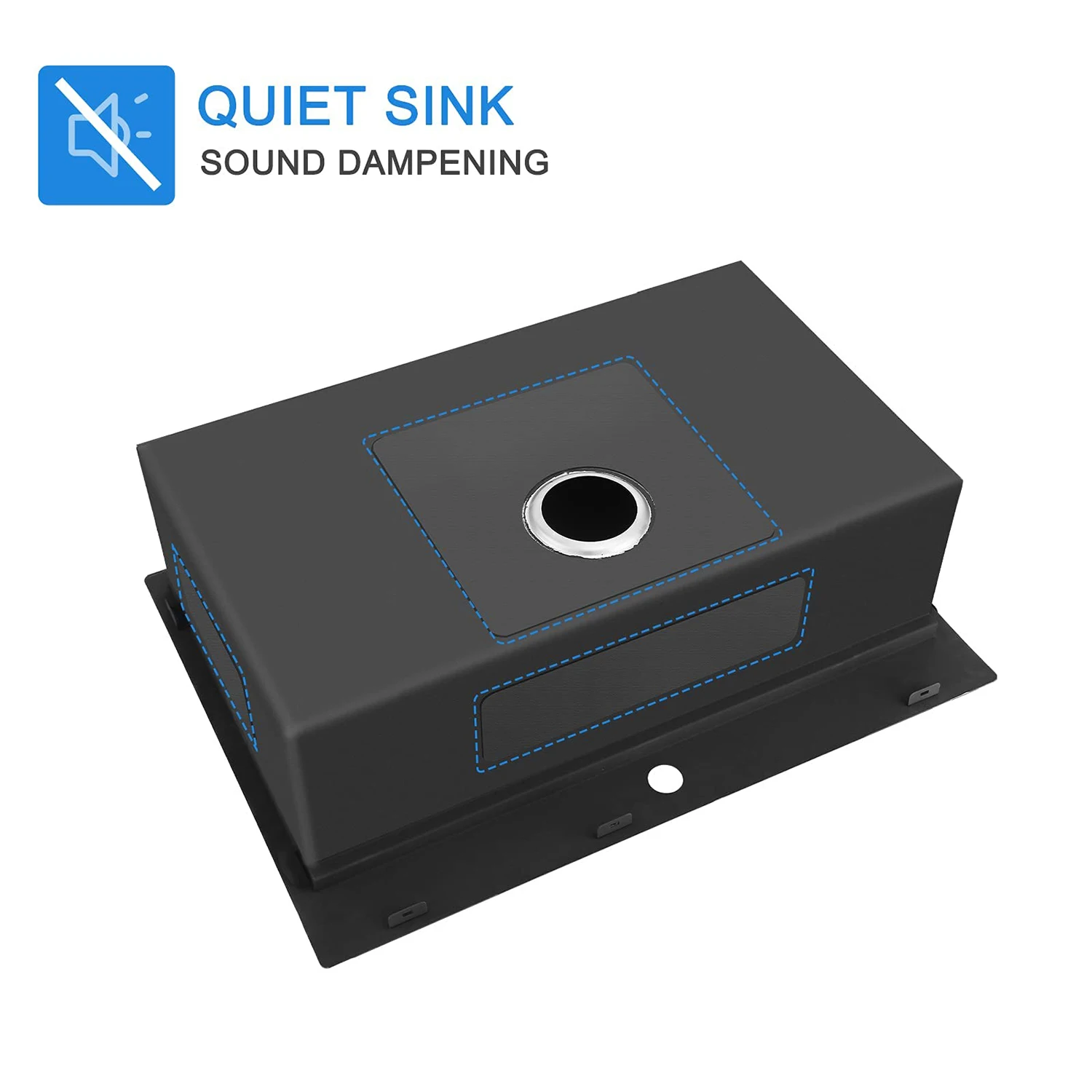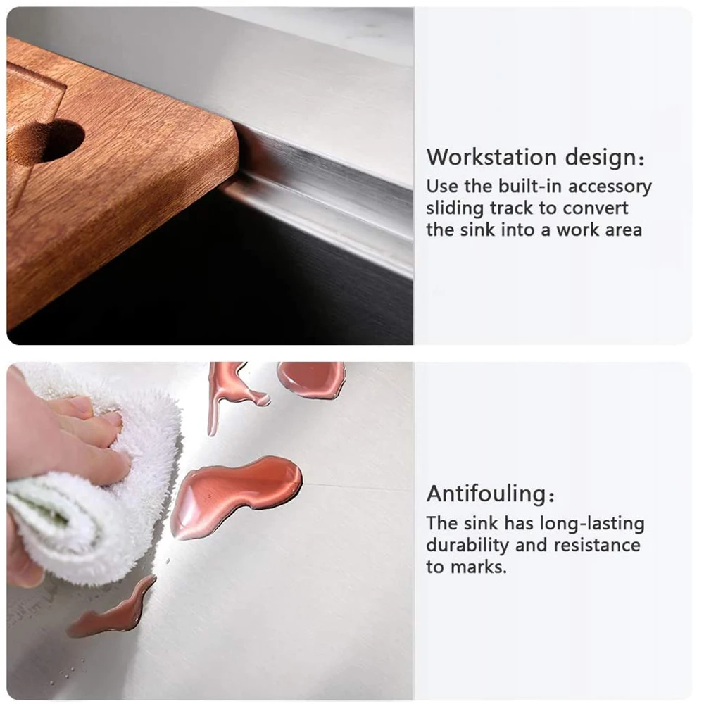 Topmount Ledged Workstation Handmade Kitchen Sink A. Topmount with ledged workstation, single bowl B. Material: Korea POSCO 304 stainless steel C. Surface: brushed D. Thickness: 16 Gauge /18 Gauge E. Rear drainer location F. Straight corner (R10) G. Side and bottom sound pads with full spray insulation H. Accessories: Strainer, bottom grid, roll-up drying rack, collander, chopping board I. Packing: Foam corner guard+4 sides plywood+carton box